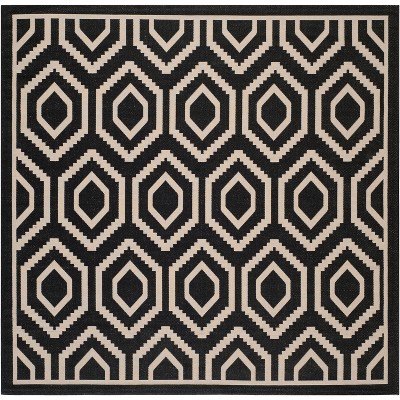 Transform your living space with our contemporary and versatile indoor/outdoor area rug, a perfect blend of style and functionality. This eye-catching 7'-10" X 7'-10" square rug, featuring a striking black and beige geometric pattern, adds a touch of elegance to any room or outdoor setting.