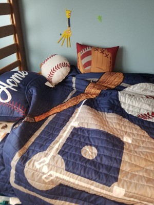 Bring the ballpark to your childs bedroom with the Lush Decor Baseball Game Quilt Set. Designed with large baseball graphics of a baseball, field, and bat on the front, adding sporty style and cozy comfort to your kids bedroom decor. If your son or daughter is a baseball fan, this is the perfect choice for a big kid bedroom makeover. The quilt features graphic prints that celebrate Americas favorite pastime, making it a standout piece of bedroom decor theyll be proud to show off. Enjoy 2 stylish looks in 1 set! Simply flip this twin quilt over to reveal a simple vertical striped pattern that mimics a vintage baseball uniform. Switch up your kids bedroom decor as often as you'd like with this sports bedding set. Whether youre creating a baseball-themed room, updating a childs bedroom set, or searching for fun and functional bedding that doubles as stylish bedroom decor, this quilt bedding set is an easy win. Available in twin and full/queen sizes. The twin size 4 piece bedding set includes 1 quilt, 1 pillow sham, and 2 decorative throw pillows. The full/queen size 5 piece bedding set includes 1 quilt, 2 pillow shams, and 2 decorative throw pillows. One accent pillow is a glove print, the other one is a round baseball for a complete look. Give your little slugger the bedroom of their dreams with bedding that blends playful design, durable comfort, and everyday ease. Crafted from a soft microfiber fabric, this twin quilt set offers softness and comfort. The lightweight polyfill filling is perfect for any season, and even makes this a great layering piece. To care for this toddler bedding, simply machine wash cold on the gentle cycle and tumble dry. Use a steamer to release wrinkles, if needed. Spot clean the decorative pillows.