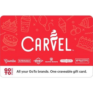 Founded in 1934, Carvel a leading provider of premium soft-serve and hand-dipped ice cream products and the manufacturer of uniquely shaped ice cream cakes, including its signature Fudgie the Whale® and Cookie Puss® creations. This Carvel gift card is also redeemable at participating Auntie Anne’s, Cinnabon, Jamba, McAlister’s Deli, Moe’s Southwest Grill and Schlotzsky’s locations.