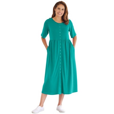 Experience ultimate comfort in this soft knit button-front dress. Elbow sleeves, relaxed style Flattering gathered waist complements every silhouette. Full skirt with a lovely sweep creates a feminine vibe. Side seam pockets add a practical touch for everyday essentials. Available in Regular (48" length) and Petite (46" length) options, both falling elegantly at mid-calf. Crafted from a breathable cotton/poly blend. Effortlessly maintains its charm with machine washable fabric. Pair with sandals, heels, sneakers, or flats for versatile styling. Imported.