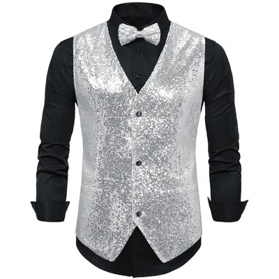 INSPIRE CHIC Men's V-Neck Disco Party Shiny Sequins Waistcoat with Bowtie