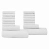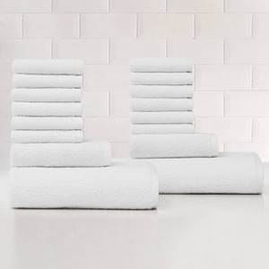 The set includes two bath towels, two hand towels, and an impressive twelve washcloths, perfect for daily beauty routines and personal care. Includes: two bath towels 27 by 52 inches, two hand towels 16 by 26 inches, and twelve wash cloths 12 by 12 inches. All items in this towel set are made from 100% cotton with a woven textured face.