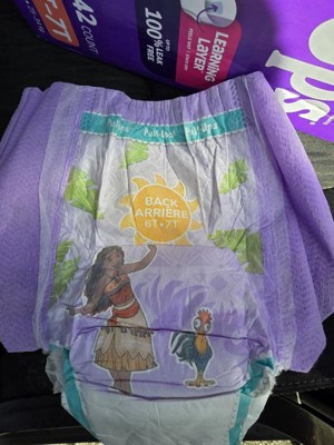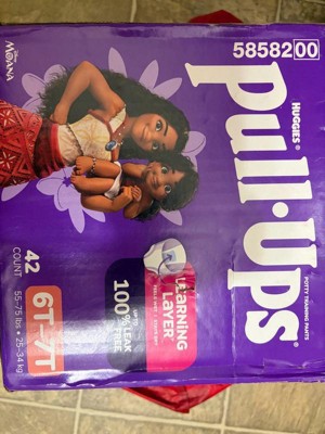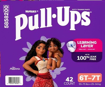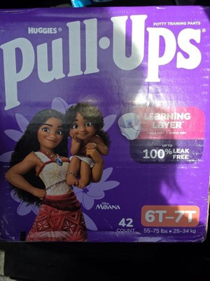 Pull-Ups Girls’ Potty Training Pants, size 6T–7T, are designed to help kids learn and grow with confidence. The Learning Layer helps children notice wetness while staying dry, making every accident a learning opportunity. With up to 100% leak-free protection, these training pants keep kids comfortable and secure. The soft, hypoallergenic material is gentle on sensitive skin, and tear-apart sides make changes quick and easy. Fun Disney's Moana graphics fade when wet to motivate kids to stay dry. Product and packaging may vary.