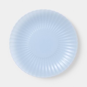 A: The dinner plate features a classic round silhouette with fluted detailing and a scalloped, raised rim.