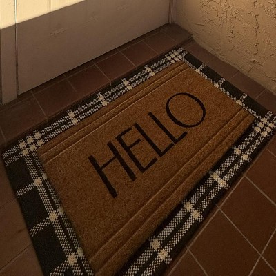 A: The doormat features the word 'Hello' in black script for a welcoming vibe.
