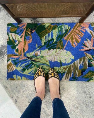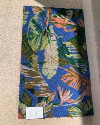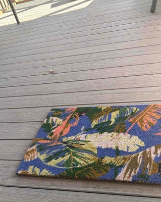 Protect your floors and add a tropical feel to your entryway with this Cavendish Canary Rectangular Outdoor Door Mat from Threshold™. Made from 100% coir, this rectangular doormat helps clear dirt and debris from shoes, while the latex backing prevents it from sliding. This medium-pile doormat features colorful leaves print that pops against the blue backdrop for a welcoming look, and you can simply shake it to clean.