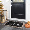 A: The doormat features the phrase 'Oh, Hello' in white letters on a black background.