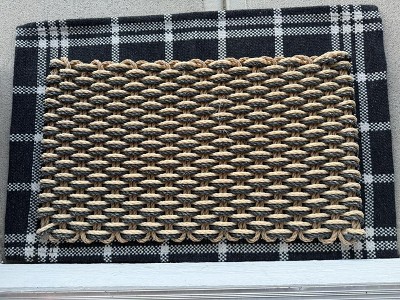 A: The doormat features a rope braided basket weave pattern in a natural hue.