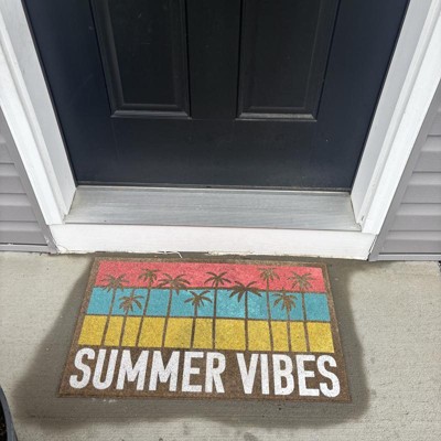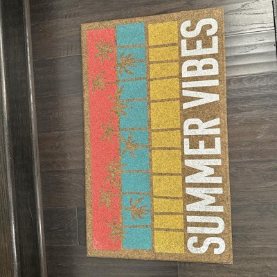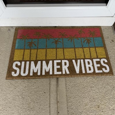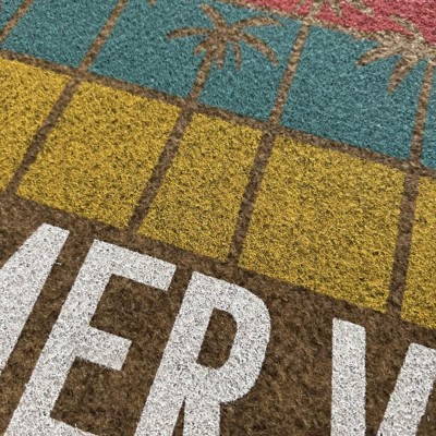 Welcome guests to your home with a tropical touch using this Summer Vibes Faux-Coir Doormat from Sun Squad™. This low-pile doormat is made of faux-coir material that effectively removes dirt and debris from shoes right at your doorstep. The rectangular doormat is adorned with print of palm trees on a striped backdrop in coral, blue and yellow hues and features the white-lettered text "Summer Vibes" to add a delightful touch to your entryway.