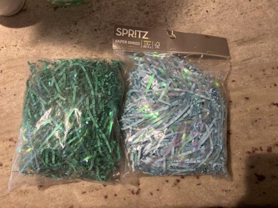 Really cute crinkle paper shreds for gift boxes or Easter basket even. The green shreds are almost a sea foam tinted green color with iridescent shreds in there to give sparkle. The paper is good quality for what we needed.