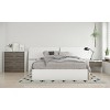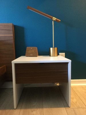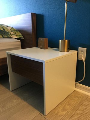 This 1-drawer modern nightstand is offered in a trendy white and bark gray finish with a scratch, stain and water resistant melamine top panel. Its convenient drawer is mounted on solid metal slides and provides handy storage when you're in bed, plus the open space at the bottom gives an airy feel to your decor.