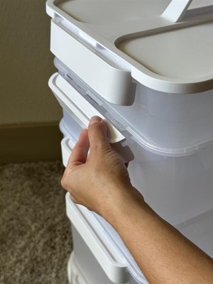 submitted byLiz - 6 months agoA: Hello Teresa - We appreciate your interest in this Click in Place 1 Open Front 2 large Bins 1 Tray with Handle Lid and Wheels. This set contains a large bin with an open front, two storage bins, and a tray with a lid boasting a top handle. They can be stacked on top of each other for efficient storage, and the top handle and four castor wheels offer easy portability. We know you will enjoy it. – Joe