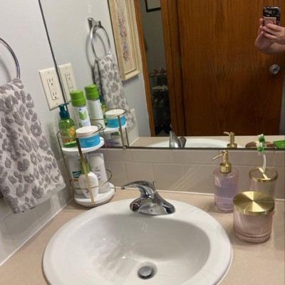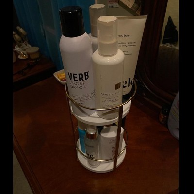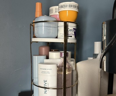Organize and decorate your home in luxurious style with the Round Metal Countertop Turntable from Brightroom™. Set on a metal frame, this round storage cart features two shelves for easy organization of your bath accessories, makeup essentials and more. The gold-tone frame complements the white shelves for an eye-catching look. Simply place this metal-frame cart on a tabletop or vanity counter to keep your space organized.