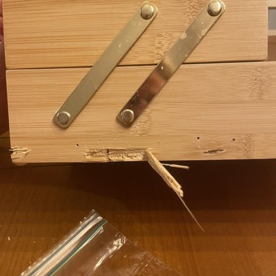 Do not buy. I bought this product a week ago and had it on my bathroom counter. I noticed the day after I purchased it that there were little holes on the side of the box. Under the holes, on the counter were little piles of sawdust. I originally thought that the holes and dusts were from water splashing on the side but oh was I wrong. Today, I mentioned it to my boyfriend and told him what was happening so he took a look at it. Upon further investigation, we found small brown/black bugs living inside the wood. Praying to the Lord that these are not bed bugs. Learn from my mistake and do not buy!! The cute aesthetics of this organizational box is not worth the risk.