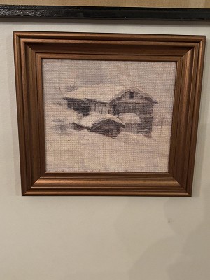 - Snowy cabin burlap framed wall art