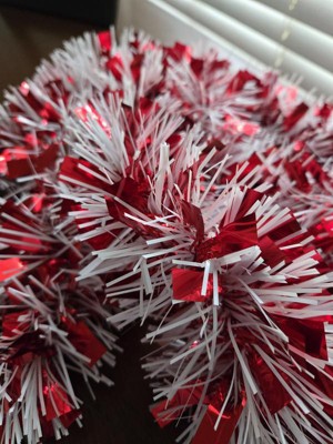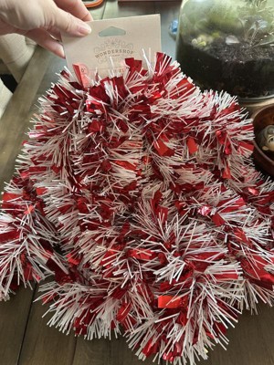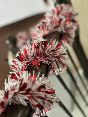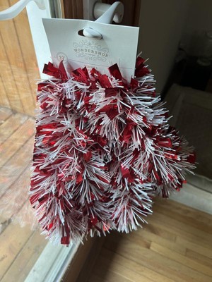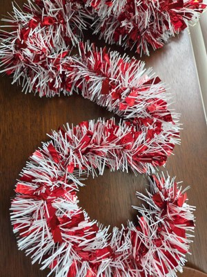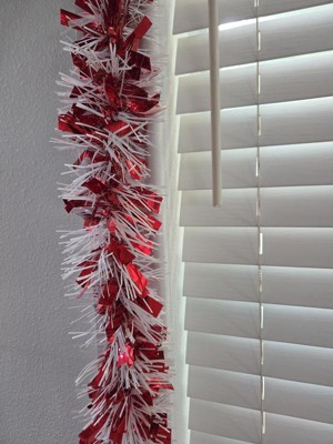 This is a 10 foot long tinsel garland, is a great length to decorate a small area, or help add to your tree. The tinsel sparkles with movement, and the red and white compliment each other with that Christmas wonder or any celebration to come. This is made well, no fallout or unraveling. Made to last for more than one use.