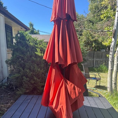 Bought this patio umbrella for my new townhouse apartment. The umbrella looks great! Like the design and shape, looks pretty with my fence and little garden. Made with great material. You use the handle to roll it open, very easy to open and close. Getting ready for the summer fun.