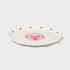 A: The plate features scalloped edges with a heart print and a playful cat face graphic.