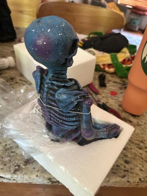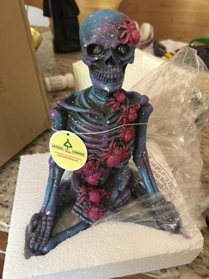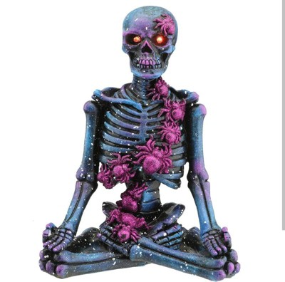 [This review was collected as part of a promotion.] Spooky check. Fun check. Extra freaky eyes check. Perfect for spooky month. I'm absolutely captivated by this meditating skeleton statue! The galaxy-like blend of blue and purple, speckled with glitter, gives it a truly ethereal feel. The contrast with the pinkish-purple spiders crawling across its body is both unsettling and strangely beautiful, a perfect blend of peacefulness and the macabre. My favorite part has to be the glowing white eyes—they add a surreal, otherworldly touch that makes this piece a definite conversation starter. It's a unique and mesmerizing decoration that I highly recommend for anyone who appreciates art with a spooky twist.