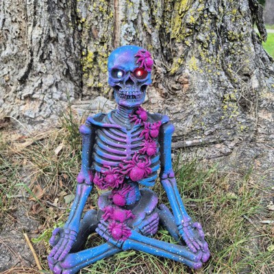 The 10 inch Purple Galaxy Yoga Skeleton is a unique and whimsical Halloween decoration that combines a touch of the mystical with a relaxed, playful vibe. The skeleton is designed in a meditative yoga pose, its bony limbs elegantly positioned as if performing a deep breathing exercise. Its posture exudes a sense of peacefulness and balance, making it a delightful contrast to the typically spooky, eerie skeleton motifs seen around Halloween. It features a pair of multicolor LED lights embedded in the skeleton’s eyes. These lights shift through various vibrant colors creating a magical glow that enhances the skeleton's celestial appearance.