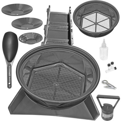 In addition to the patented sluice box, the Sluice Fox kit includes high-quality tools to make your panning experience as effective and enjoyable as possible. A 13-inch sifting pan fits atop a five-gallon bucket and is designed to separate out rocks and larger debris, enabling you to focus on the finer materials where gold is most often found. Once classified, you can switch to the 11-inch and 9-inch spiral gold pans. Each pan features ridged edges that trap fine gold particles, helping you maximize your recovery rate. The 11-inch pan is perfect for larger areas, while the smaller 9-inch pan offers precision and control, ideal for zeroing in on potential gold-rich spots.