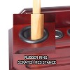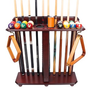 The floor stand billiard pool cue rack is made of solid wood, has a furniture-grade paint finish, and requires simple assembly. The pool stick stand cue rack holds up to 10 pool cues, a complete set of pool balls, 2 cup holes, and has 2 metal hooks that can hang pool ball racks.