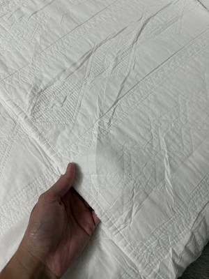 I love that it’s 100% cotton—super fresh and it doesn’t make me feel hot at night. It is quite thin, but that’s exactly what I was looking for because I wanted a cotton quilt. The design is simple, and I love how it looks with my cream sheets!