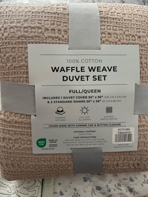 [This review was collected as part of a promotion.] I’m seriously impressed. Right out of the package, I could feel the quality. The cotton waffle texture adds a touch of cozy elegance to my bedroom, and it looks effortlessly chic on my bed. The fabric is soft and breathable—perfect for year-round comfort. It feels lightweight but still keeps me warm at night, and I love that it's made from 100% cotton. It washed beautifully with no shrinkage or pilling, and the texture stayed intact. The duvet cover has corner ties, which help keep the insert in place (no more bunching!), and the hidden button closure adds a clean, finished look. I haven’t added the insert but it already lays true to size and drapes nicely without being bulky. If you're looking to upgrade your bedding with something simple, stylish, and high-quality, this set is a win. Highly recommend!