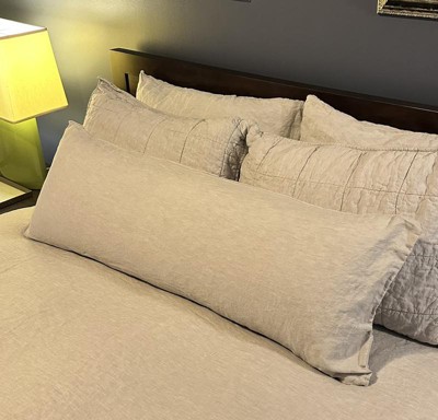 We decided to add this Pebble Heather Pinstripe lumbar pillow to our queen size bed set. We did all the same color but having another layer of a long pillow is very cozy. I really like the size of this lumbar pillow, and the case came out of the dryer and right onto the bed and looks great. The linen feels soft and cool, it really breathes well and doesn't get hot at night.