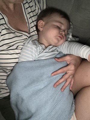 Beautiful baby blue knit blanket. Love that it is organic and I don’t have to worry about chemicals leeching on to my baby’s skin. Perfect blanket to rock him with, plan to put in his crib when he turns one (if I don’t keep it for myself!). Would be perfect for newborn photos. It is sizable for a baby blanket too, about the size of a standard adult towel. Could see my baby loving this for years
