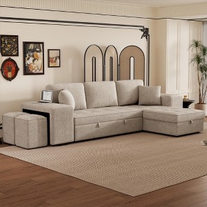 104" Pull Out Sleeper Sofa, Reversible L-Shape Sectional Couch with Storage Chaise and 2 Stools-ModernLuxe