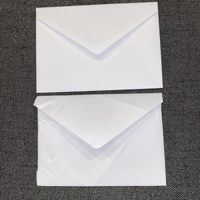 About 3-4 envelopes were stuck on the inside so I had to pull it apart to put the card inside. After that, you could see from the outside that the paper was thinner in that area. The envelopes were probably stuck on the inside due to too much glue. On top of that, one whole envelope was crinkled and folded. The card itself is nice and of average thickness. The envelope is where they cheaped out. It is too thin.