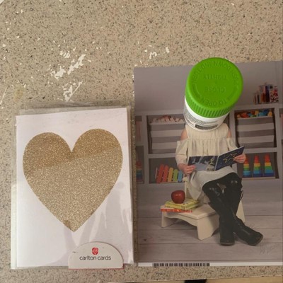 Both the product description and photos specified glitter, but in the set of cards that I received, there is none - the heart is plain gold foil. Still cute, just not as described - and the glitter would have been a lot cuter. Also, as other reviews have mentioned, the cardboard is very thin - more like construction paper.