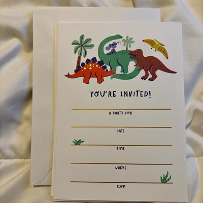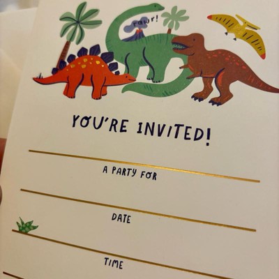 [This review was collected as part of a promotion.] I was surprised by the quality of these invitations. The paper is pretty thick and sturdy. I love the colors and design with the dinosaurs and the shiny gold lines. They look very nice! The set comes with 10 invitations and 10 envelopes which is perfect for what we will need for a party. The dinosaurs are a big hit too and so cute!