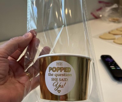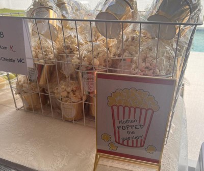 These were the perfect size to put popcorn in for an engagement party and we put stickers on the front that said “He popped the question!” and then put the cup with the popcorn inside a cellophane baggie with a gold twisty tie at the top (we used bagged popcorn and it stayed fresh for a few days so you can even make the bags a day or two before your event.). They turned out really cute and the price is good for what you get
