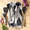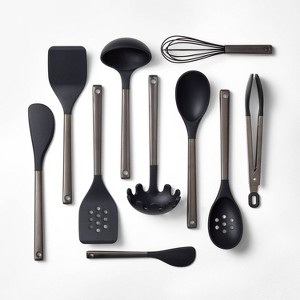 - Includes slotted turner, whisk, ladle, turner, spatula, pasta spoon, spoon, tongs, mini spatula, slotted spoon
