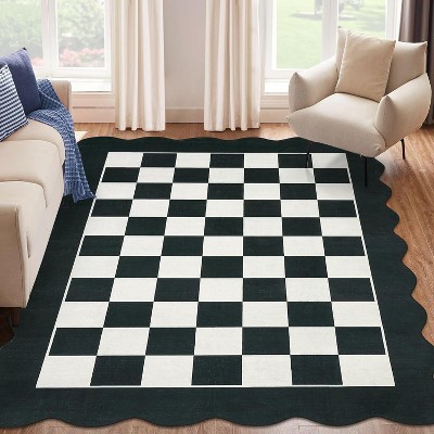10x13 Scalloped Washable Area Rug Low Pile Neutral Checkerboard Carpet for Living Room, Dining Room, Bedroom Office Brown