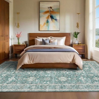 10x13 Washable Boho Floral Area Rug for Bedroom, Non-Slip, Low-Pile Indoor Carpet for Living Room, Nursery, Playroom, Blue