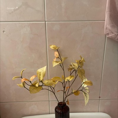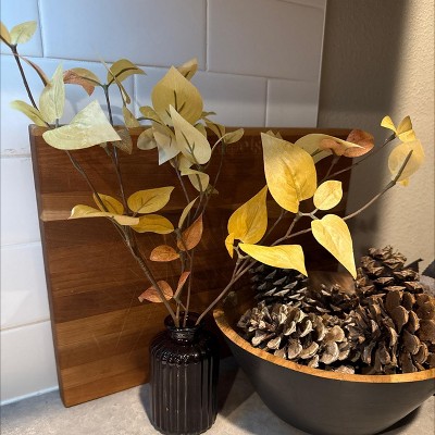 Elevate the look and feel of your home with this 11" Golden Dogwood Artificial Fall Arrangement from Hearth & Hand™ with Magnolia. Made of polyester, this plant arrangement features faux golden dogwood leaves on a single stem that instantly uplifts the vibe of any space. This faux plant arrangement is housed in a ribbed glass container for adding a rustic touch to your decor. Place it on the tabletop or mantel for a stunning display.