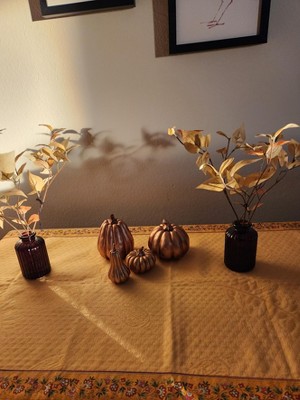 I love these little vases with the golden leaves. I paired them with the little bronze pumpkins and gourd that I got from the front of the store. They look so pretty together!