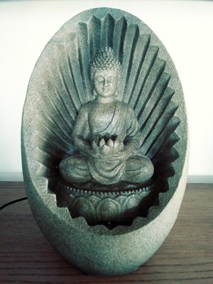 [This review was collected as part of a promotion.] This Buddha tabletop water fountain is made of durable polystone .I love how the water cascades down, with the light shining on it. Looks nice on the mantel or wherever you place it