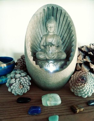 [This review was collected as part of a promotion.] I am in love with this Buddha Fountain! I like that it makes little to no noise, but find that watching it is so soothing. The light is very soft, giving it a lovely glow. And I like the natural feel and look of the material. It looks and has the texture of real stone, but is light, and so easy to clean with just a damp towel. Since it's only 11" high, it can fit on any shelf, desk, table, anywhere! I would recommend this fountain for anyone seeking a more relaxed, zen space.