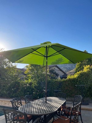 [This review was collected as part of a promotion.] I love the color and size of this umbrella. It is perfect for the large table as it provides lots of shade no matter where you sit. It is easy to put up and down also. The tilting function requires you reach all the way up to push a release button. Then you must spin the umbrella to angle it correctly for shade. This is a little bit challenging if you are short like me. The material seems thin but it still provides decent shade. It didn’t come with a tie for when it is closed. Since we live in a very windy area, I just cut a length of rope to use to tie it shut. We will see how this holds up.