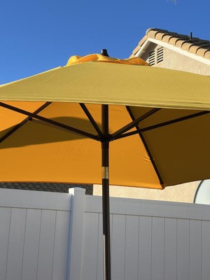 [This review was collected as part of a promotion.] This 11-Foot Aluminum Market Patio Umbrella with Crank Lift and Push-Button Tilt in Tuscan Polyester is beautiful all around, it is huge, has such a beautiful color. It is easy to open up with the crank lift and the push button, it has a large range to cover and offer shade in sunny and hot days. I bought a heavy plastic bottom part to put the patio umbrella pole in to hold it and stand up. It goes pretty great with the rest of my patio and outside furniture. The crank lift and push button are very to operate to open the umbrella and to close it also, the texture of the umbrella material is very nice and kind of thick.