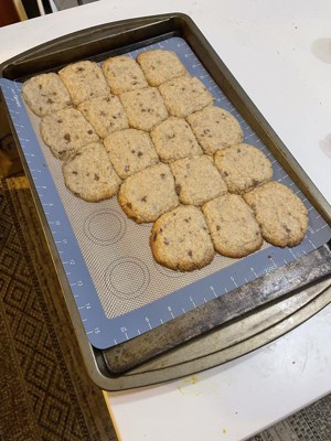 I like this product. Helps so much with cleaning up after baking something sticky or gooey. The cookies I made to test it out slid right off the silicone mat with a spatula. The only issue I had with this product was it didn’t quite fit the baking sheet I had so I had to push it into the corner on the sides to get it flat.