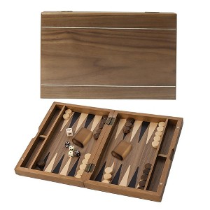 - COMPLETE SET - The wooden backgammon game set includes a folding backgammon game board, a complete set of 15 natural wood and 15 coffee colors backgammon game pieces, two large wooden dice cups, two pairs of dice, a doubling cube, and game instructions.