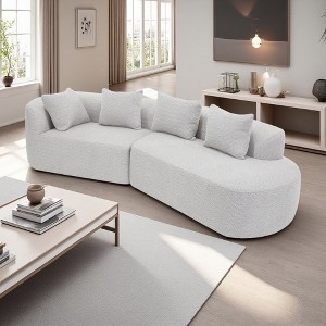 - Modern Aesthetic Appeal Designed with a sophisticated curved silhouette, this sofa adds a touch of modern luxury to any living space. Its smooth, flowing lines and plush pearl fabric upholstery create a harmonious blend of comfort and style, making it a versatile centerpiece that effortlessly complements a wide range of interior themes¡ªfrom contemporary chic to retro-inspired elegance.