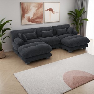 - Oversized U-Shaped Couch This modern sectional sofa includes two ottomans and a 3-seater couch crafted from soft, durable, and exquisite vintage pelletized velvet. The plush upholstery offers comfortable seating for everyone. The elegantly designed round bolster armrests are well-padded to provide excellent support for your arms, and their curved shape also offers comfortable head support when reclining.