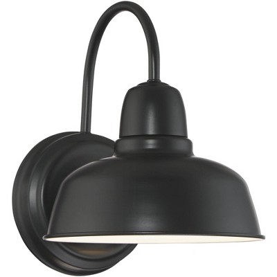 This wall light's wide metal shade and two-tone color scheme offer vintage charm in classic gray and white