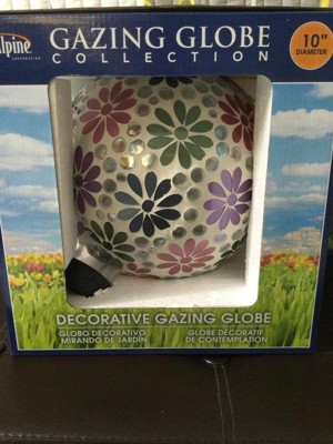 [This review was collected as part of a promotion.] I received Alpine Corporation Indoor/Outdoor Glass Floral Gazing Globe Yard Decoration. This Glass Globe has lots of bright colored flowers all over it, and it look beautiful in my flower garden. I would highly recommend this Glass Gazing ball.